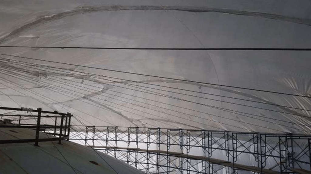 The solution selected was to shrink-wrap the tower. The shrink wrap would be a structural component of the stabilization and not just an enclosure. When most people hear of shrink wrap, they think of Figure 16. It’s a lightweight, weather-tight polyethylene covering for winter storage, usually about 6 or 7 mils thick.